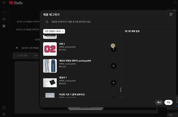 ② 라이브 제목, 카테고리, 공개 설정 등 체크 후 제품 태그하기 클릭