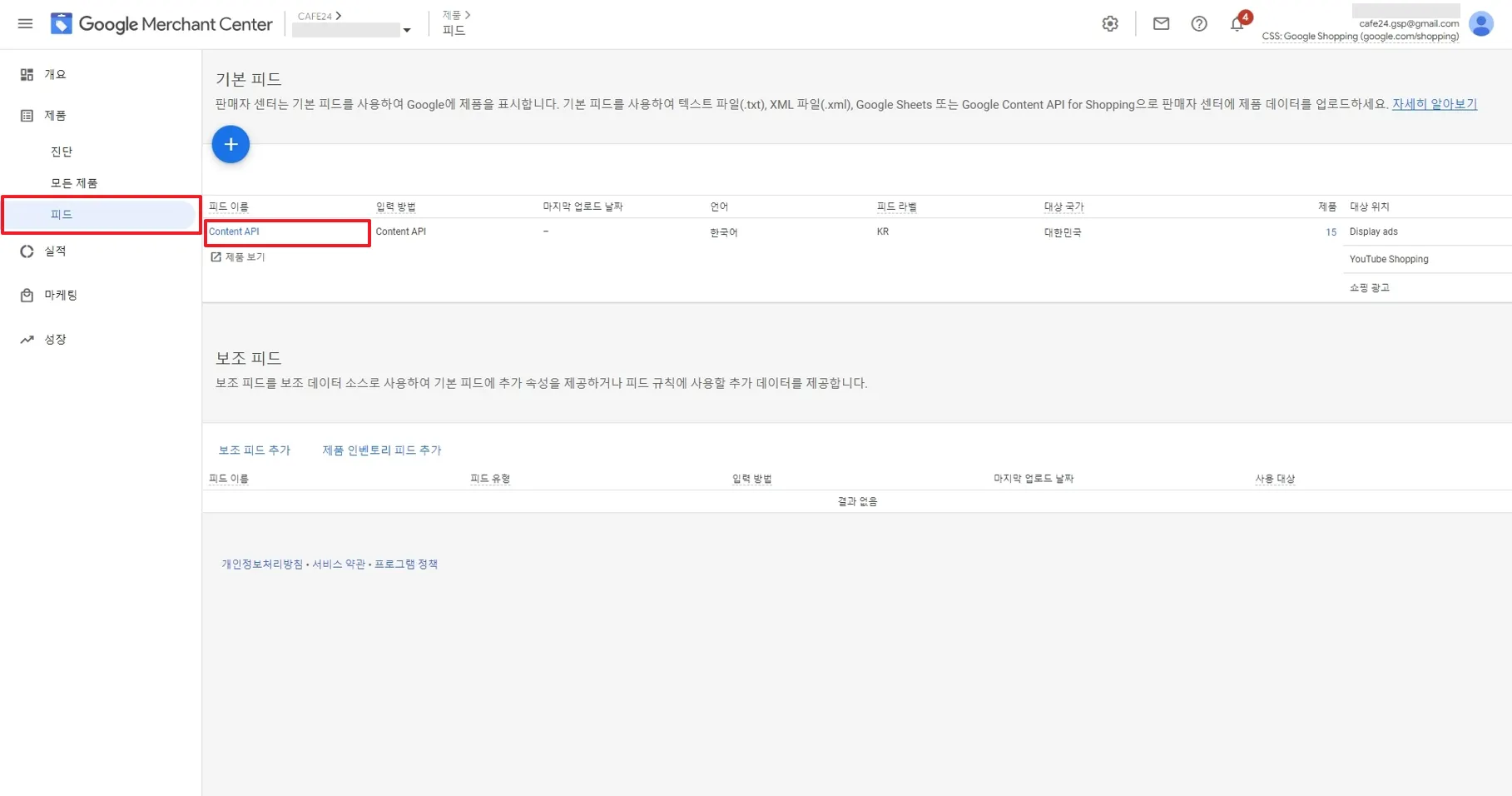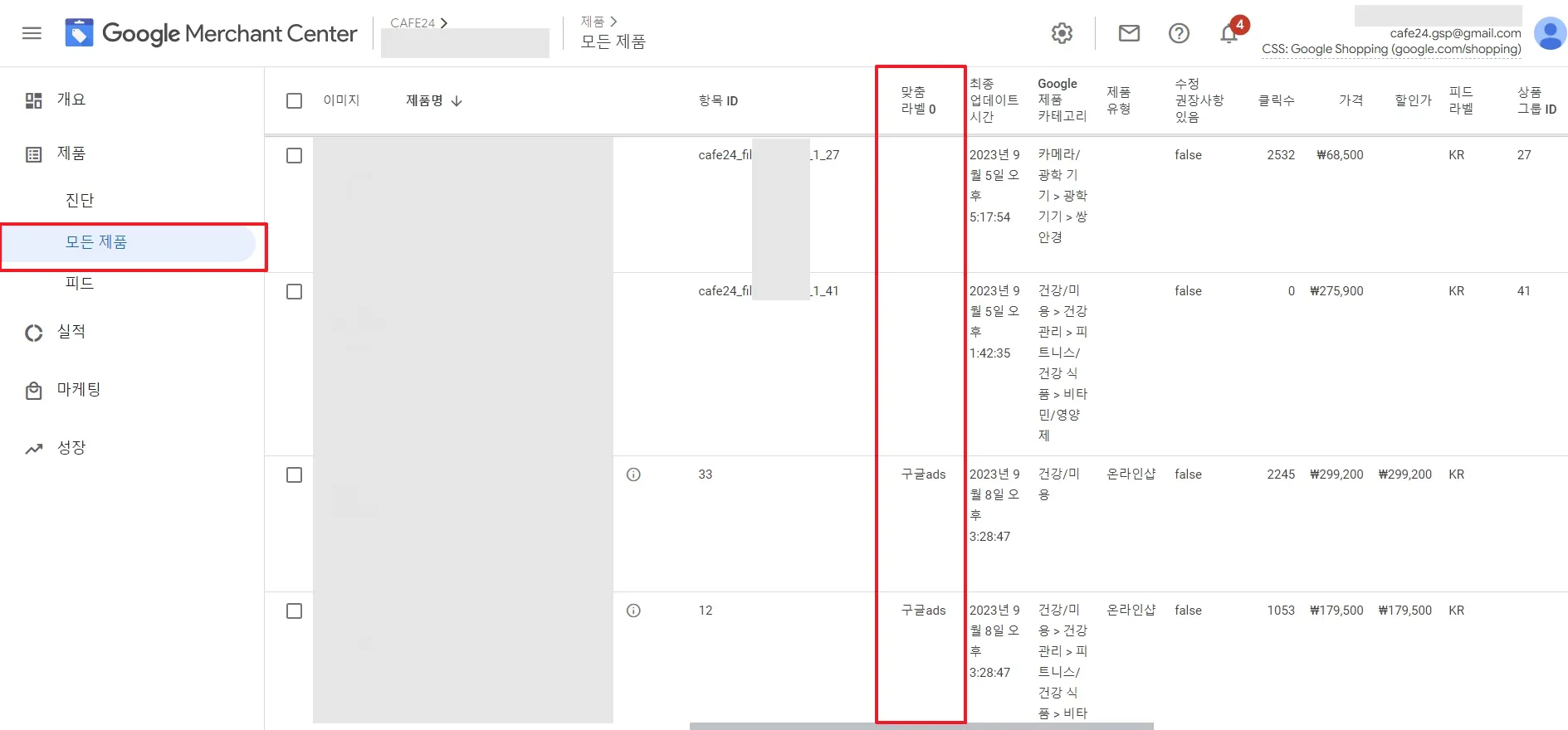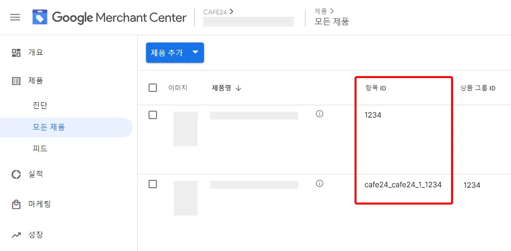 기존 광고 운영 피드와 새로 생성된 피드는 GMC [모든 제품] 탭에 동일한 제품이 2개로 보입니다.