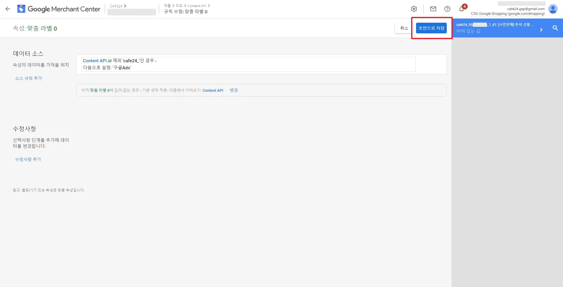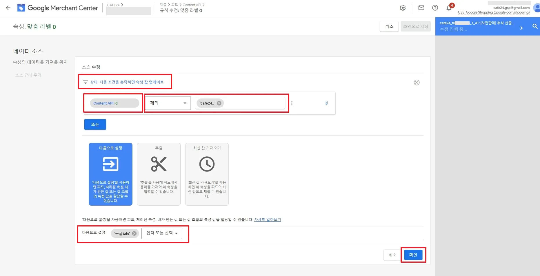 GMC에서 기존 제품 (항목ID : 숫자) [맞춤라벨0] 에 '구글ads' 구분자를 삽입