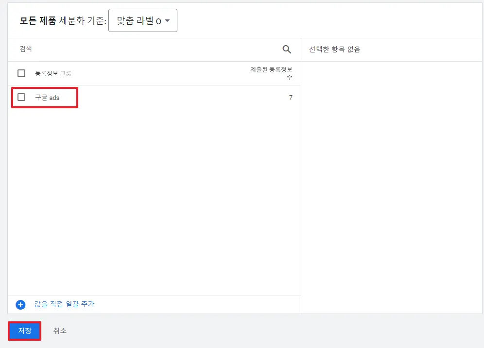구글 실적 최대화 캠페인 등 제품 피드를 활용하는 광고에서 모든 제품으로 설정되어 있을 경우