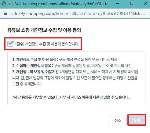 유튜브 쇼핑 개인정보 수집 및 이용 동의