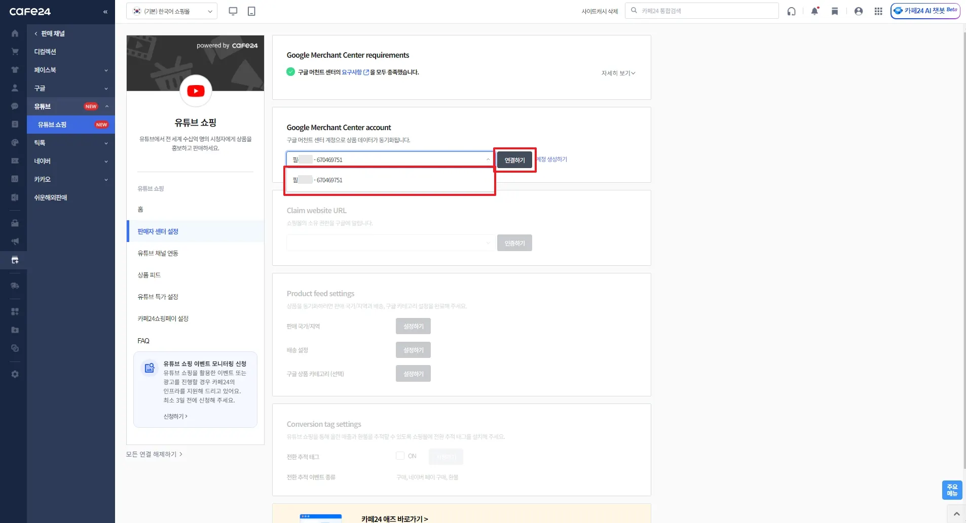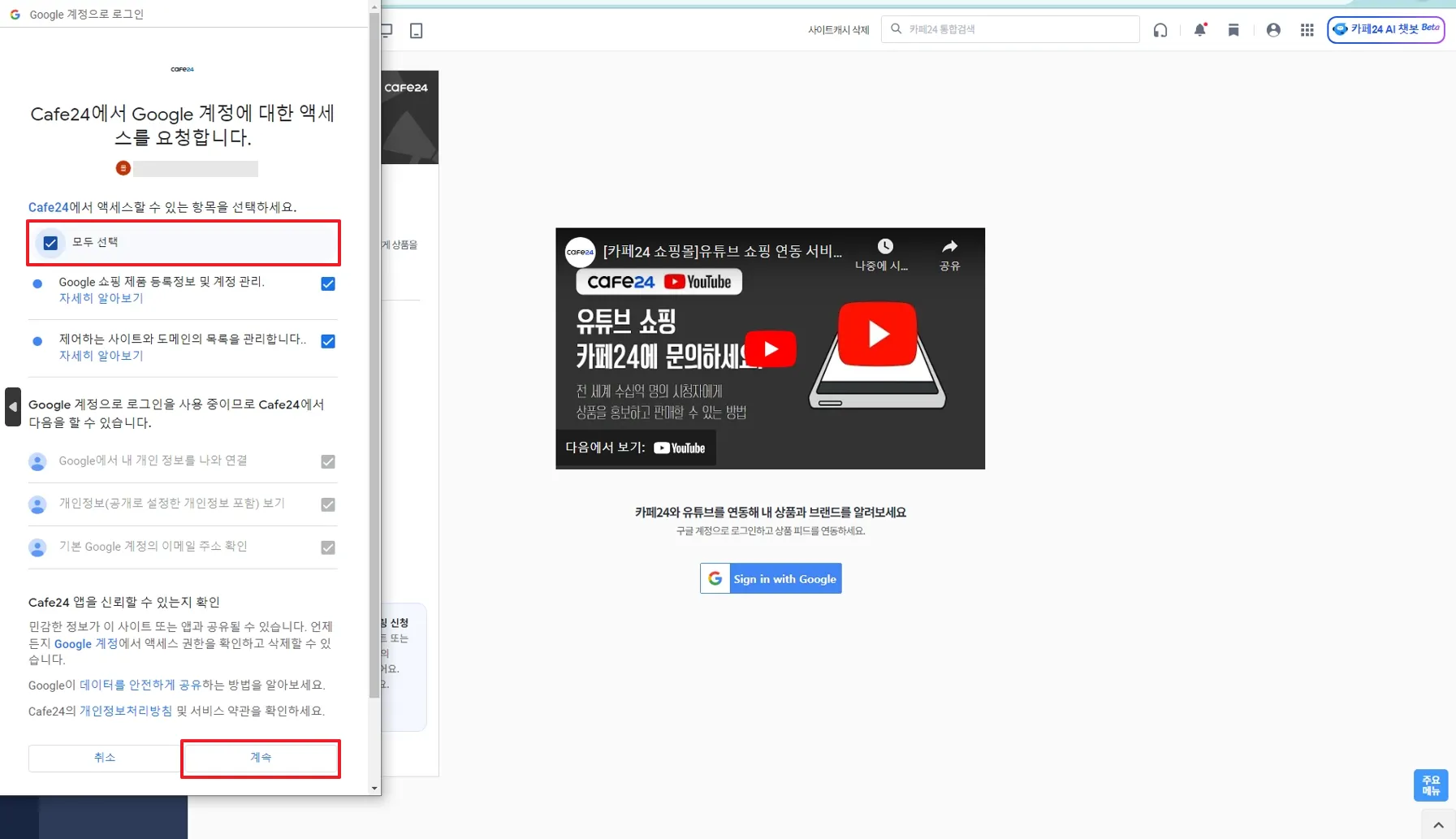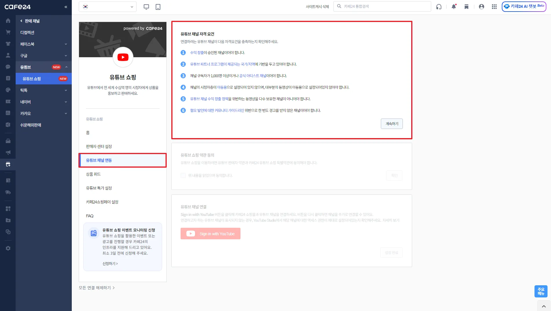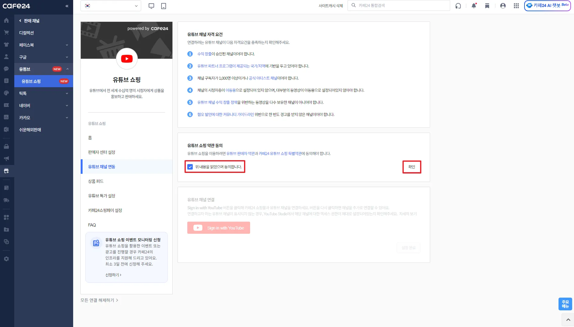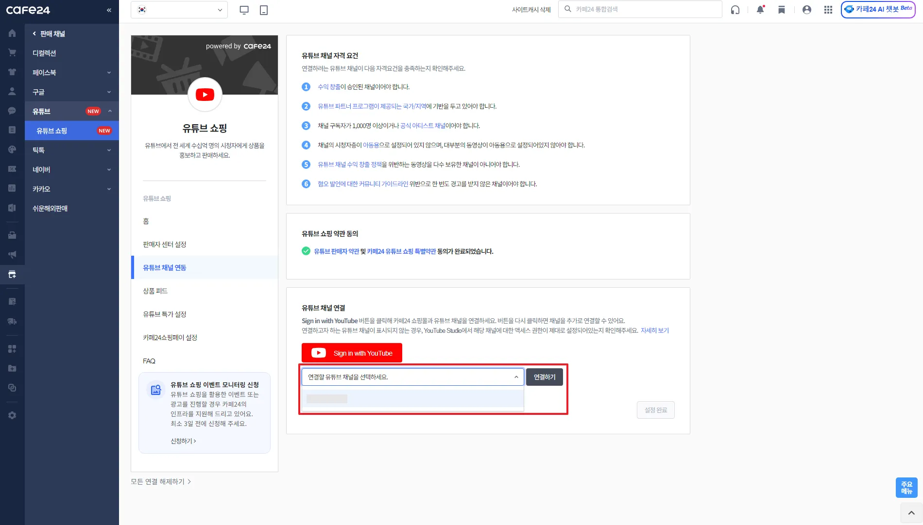 카페24 쇼핑몰과 연결할 유튜브 채널 선택