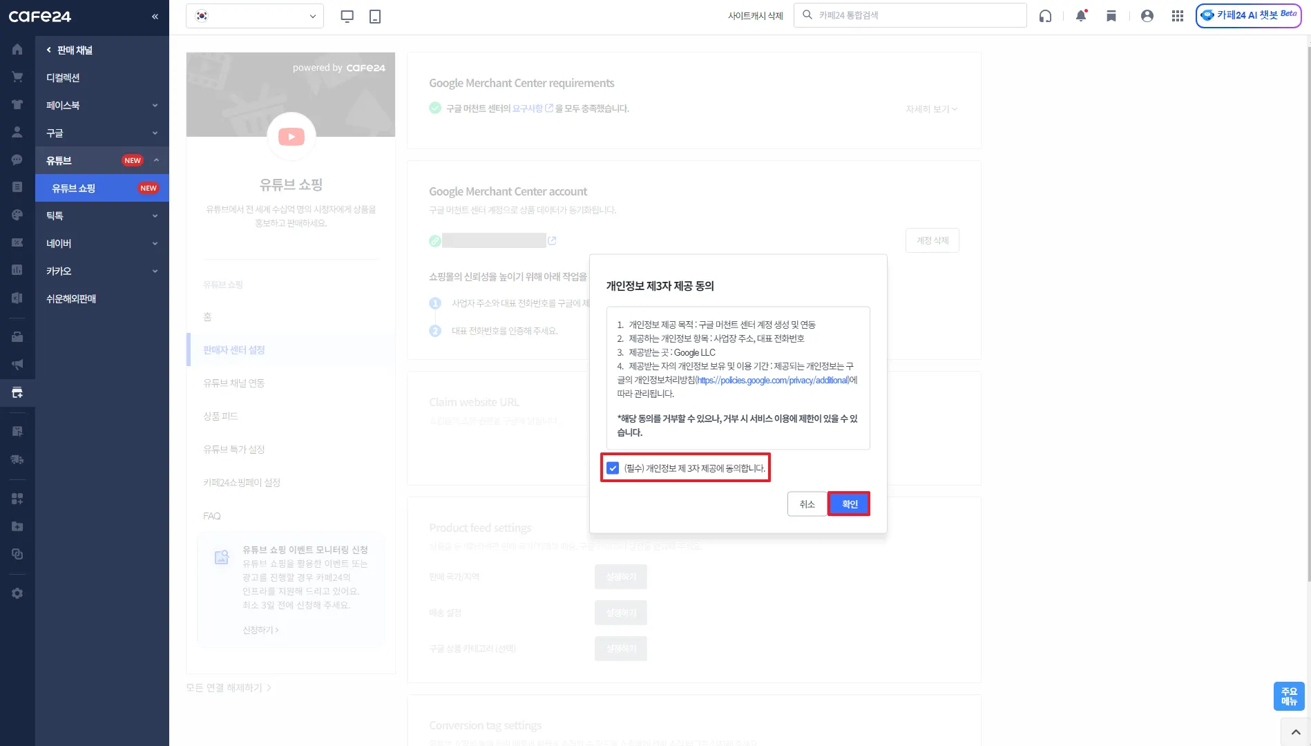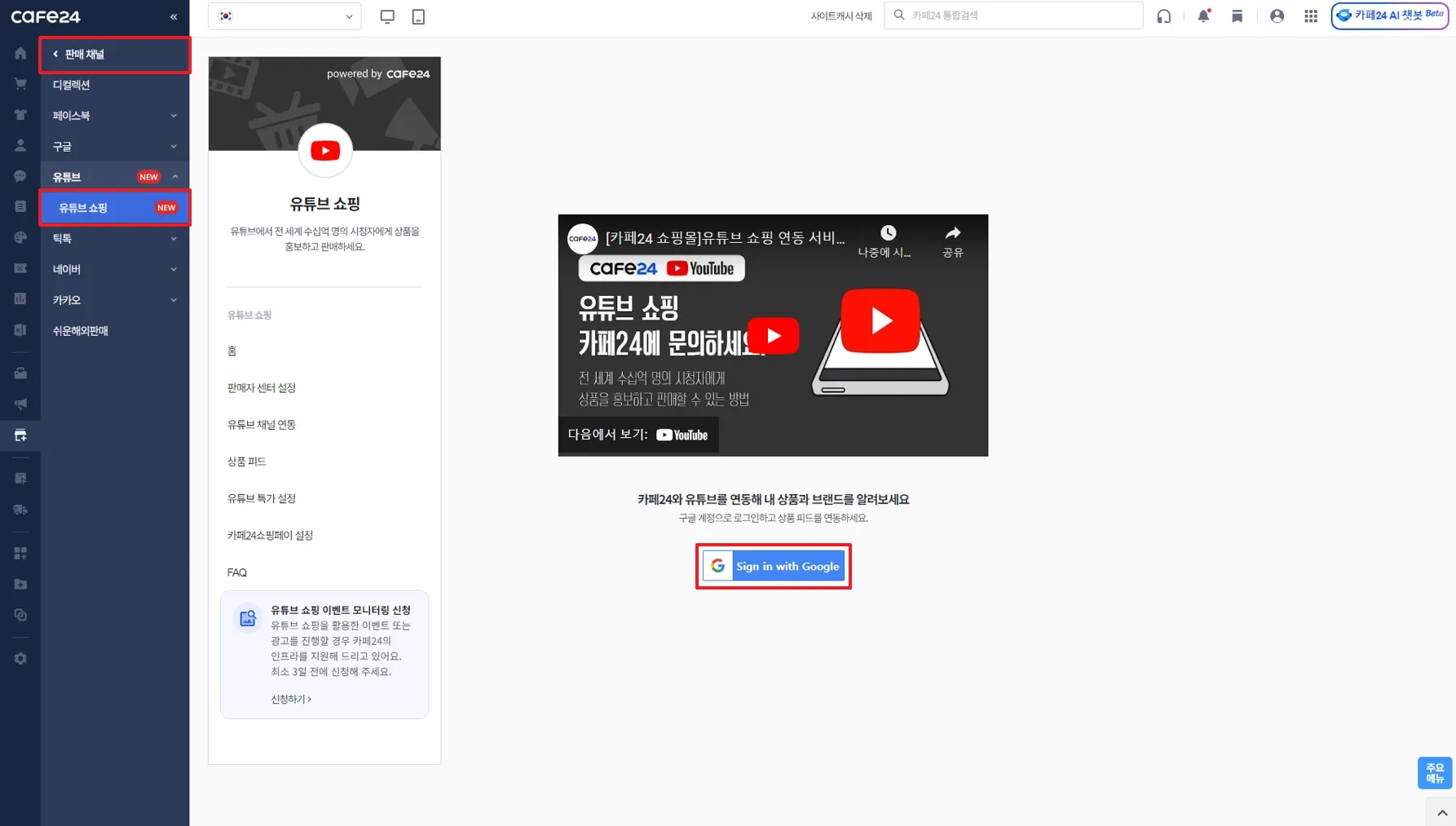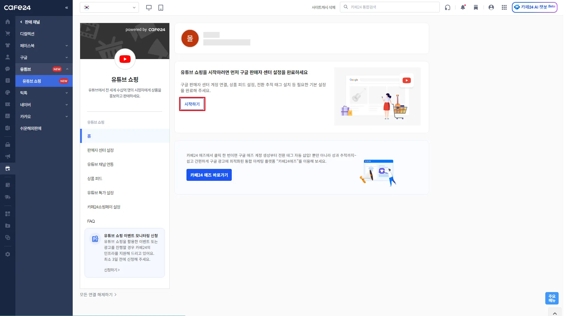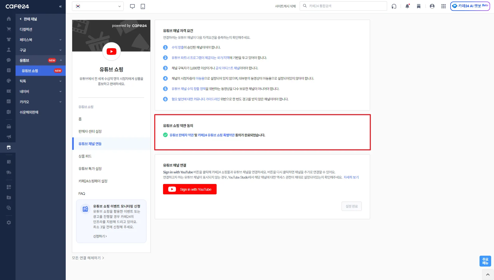 카페24 쇼핑몰과 연결할 유튜브 채널 선택
