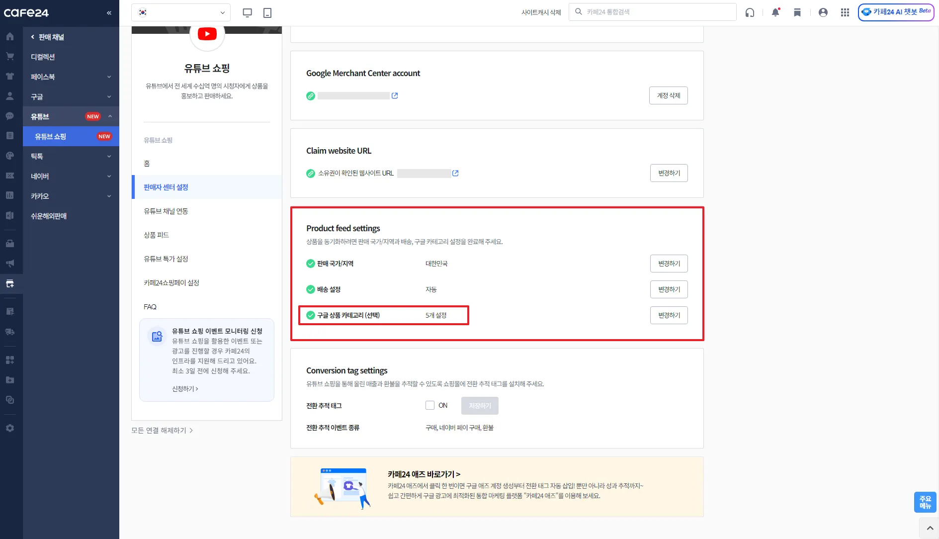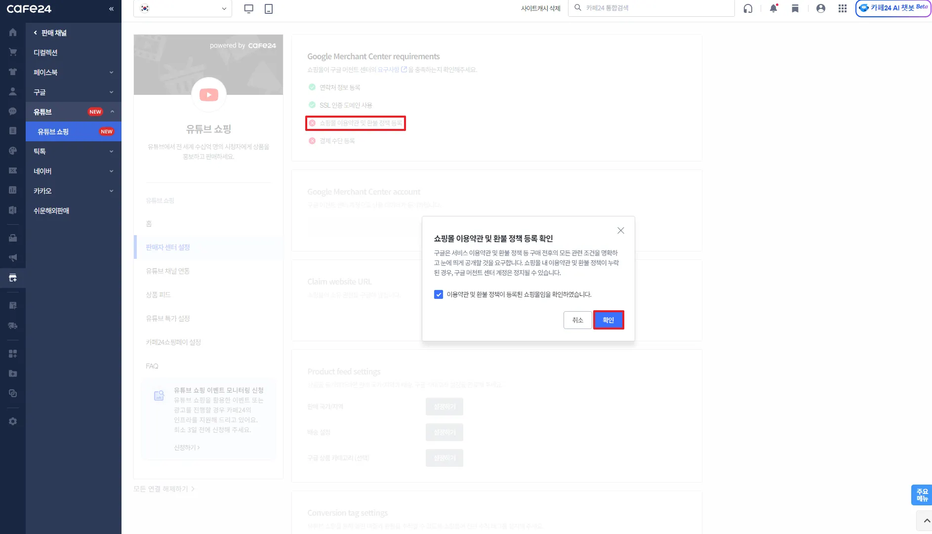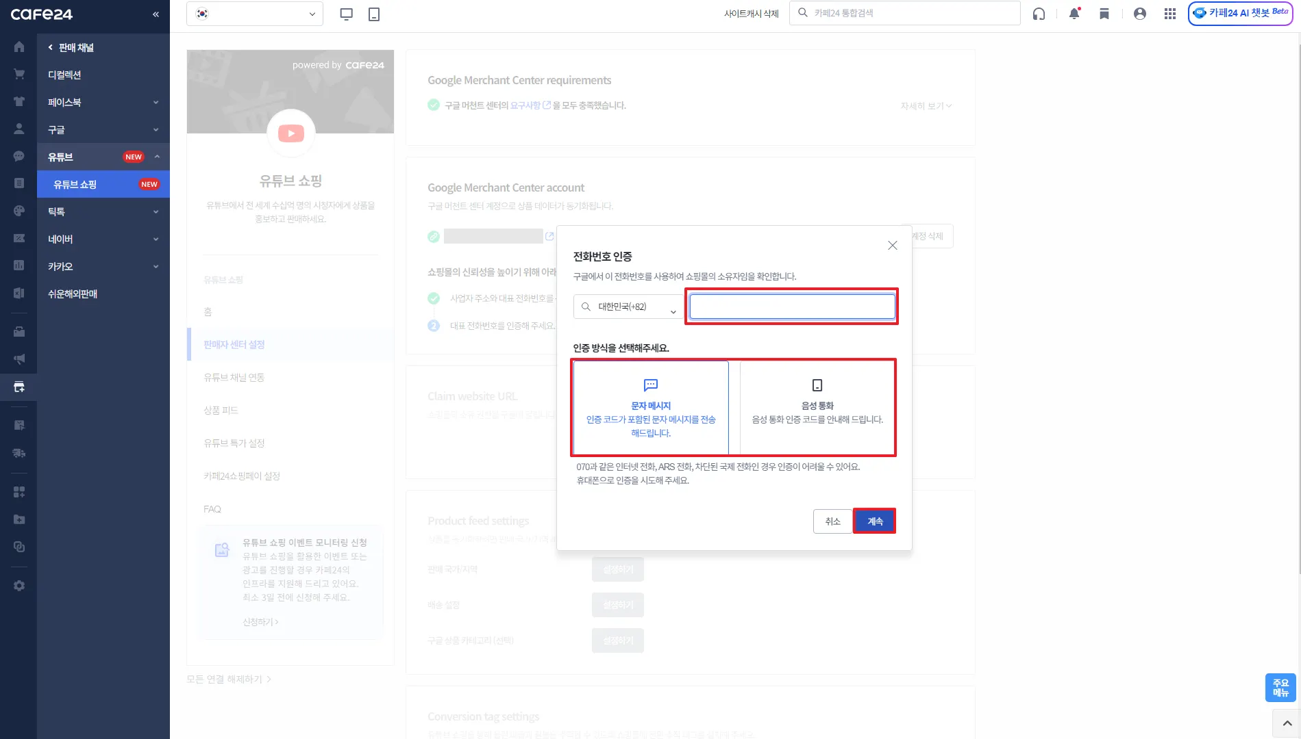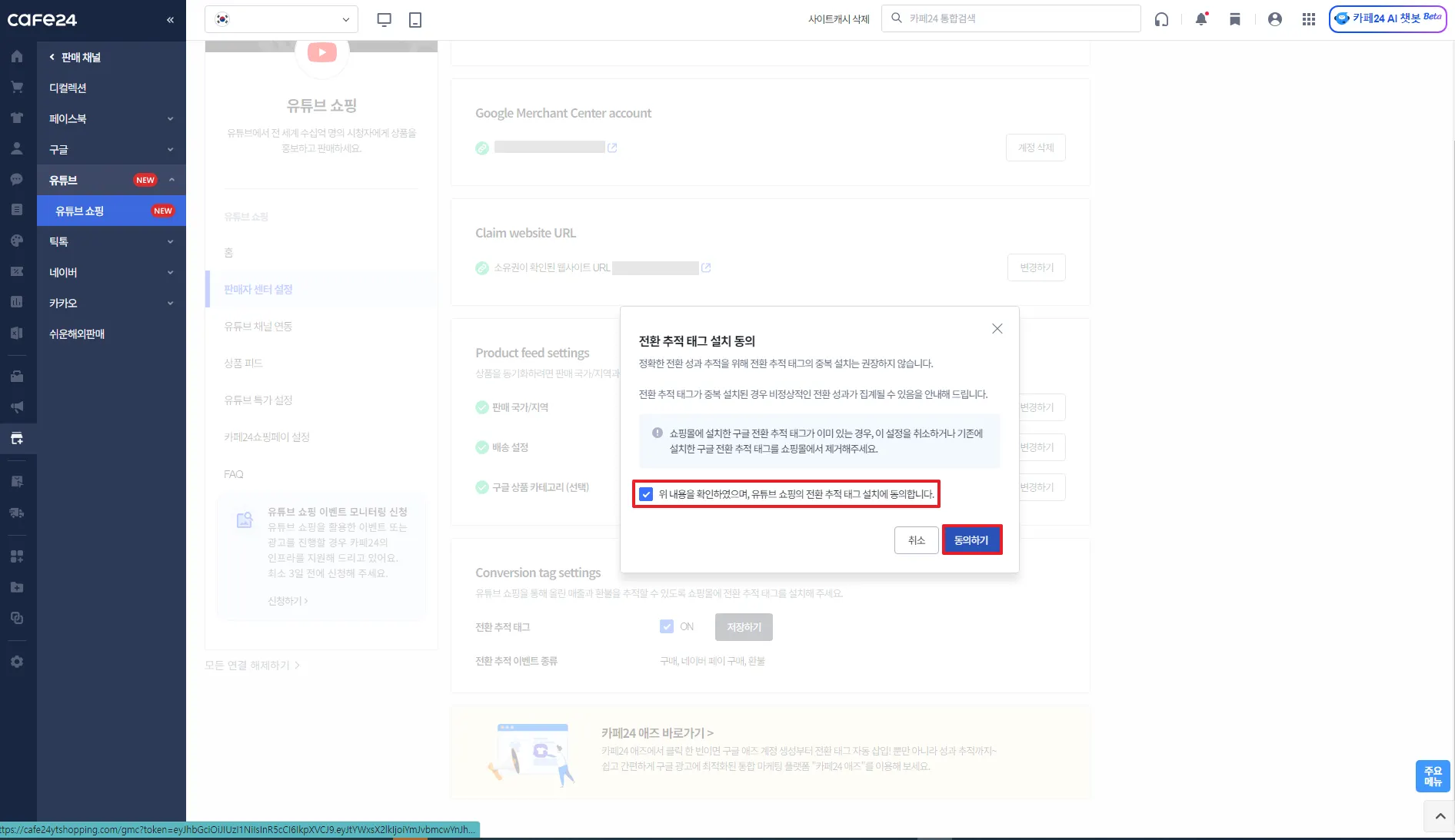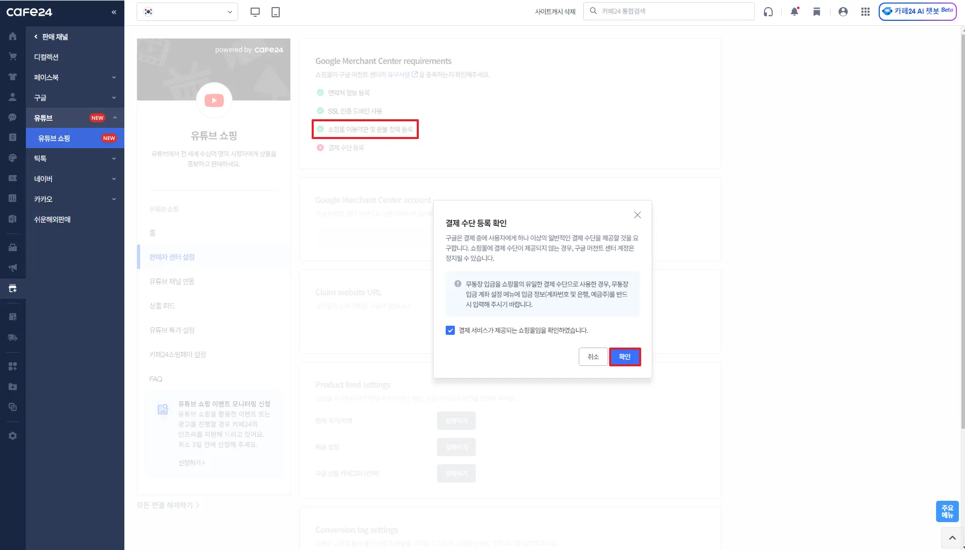 카페24 쇼핑몰과 연결할 유튜브 채널 선택