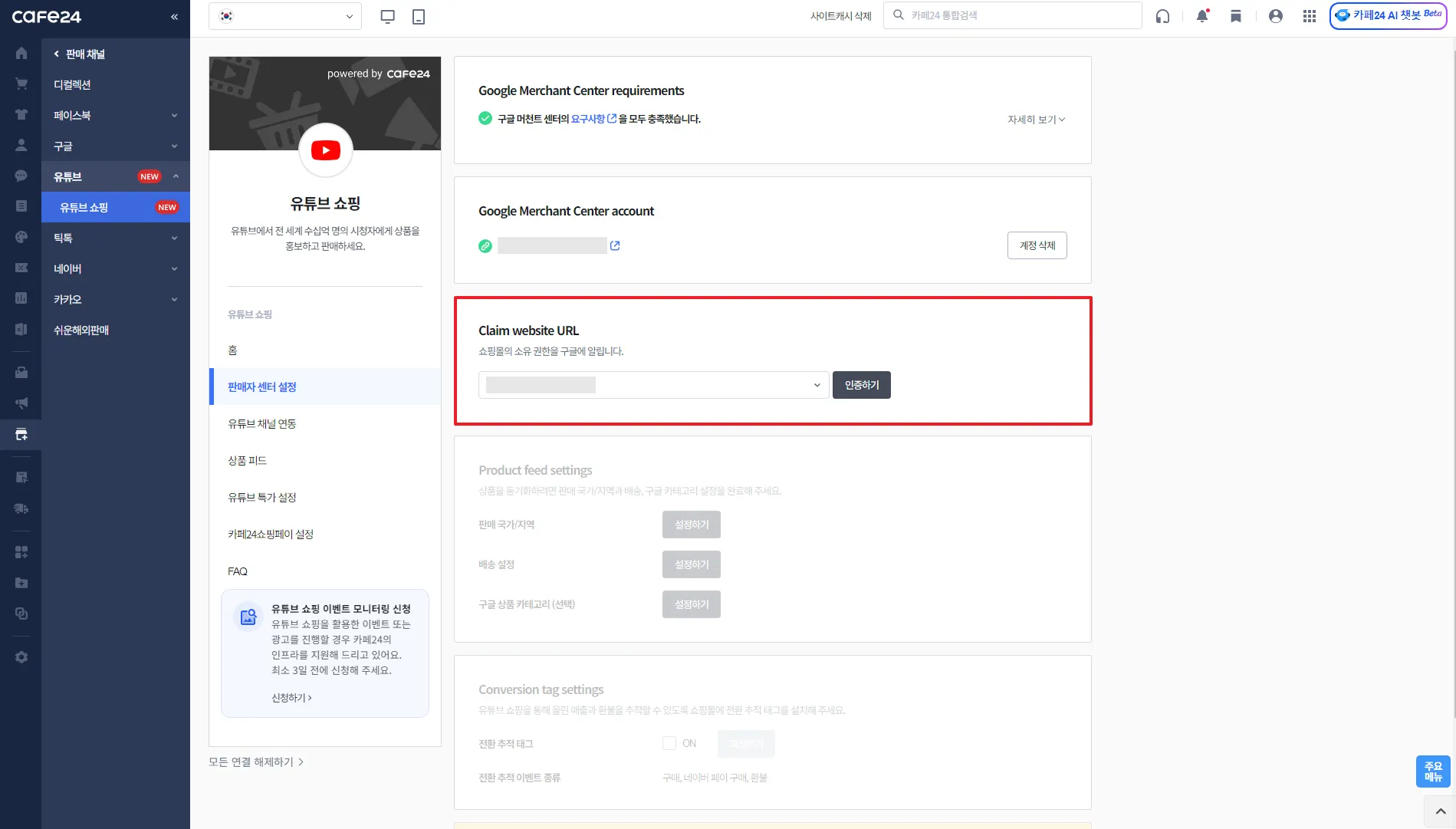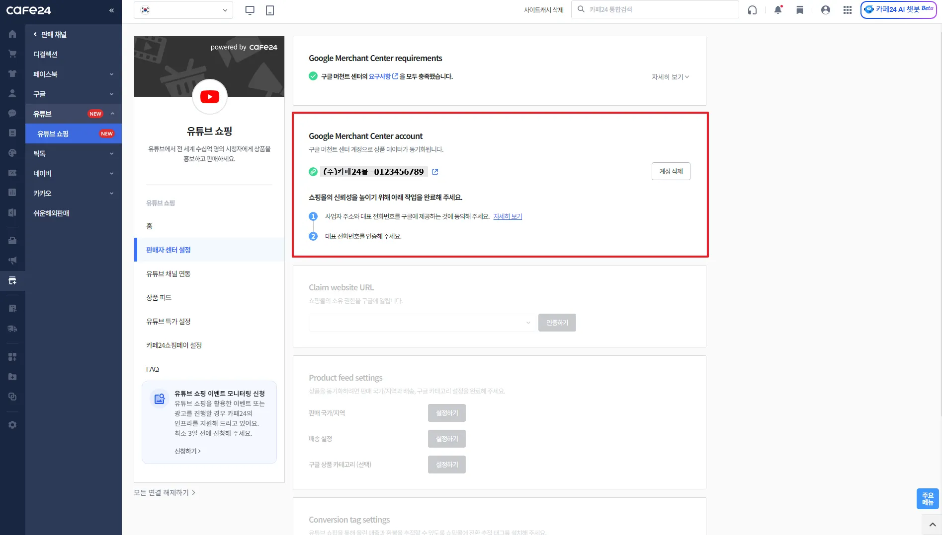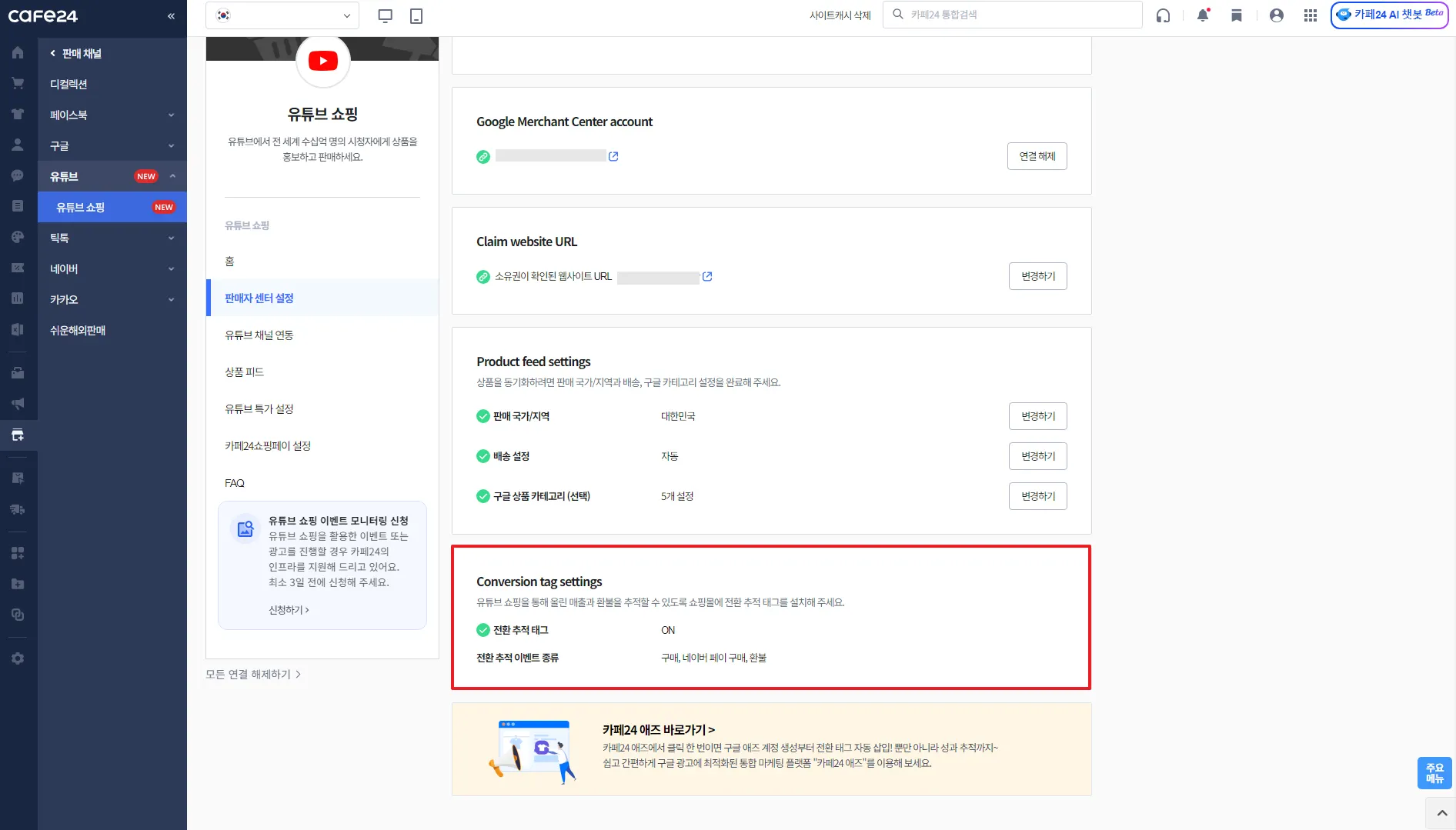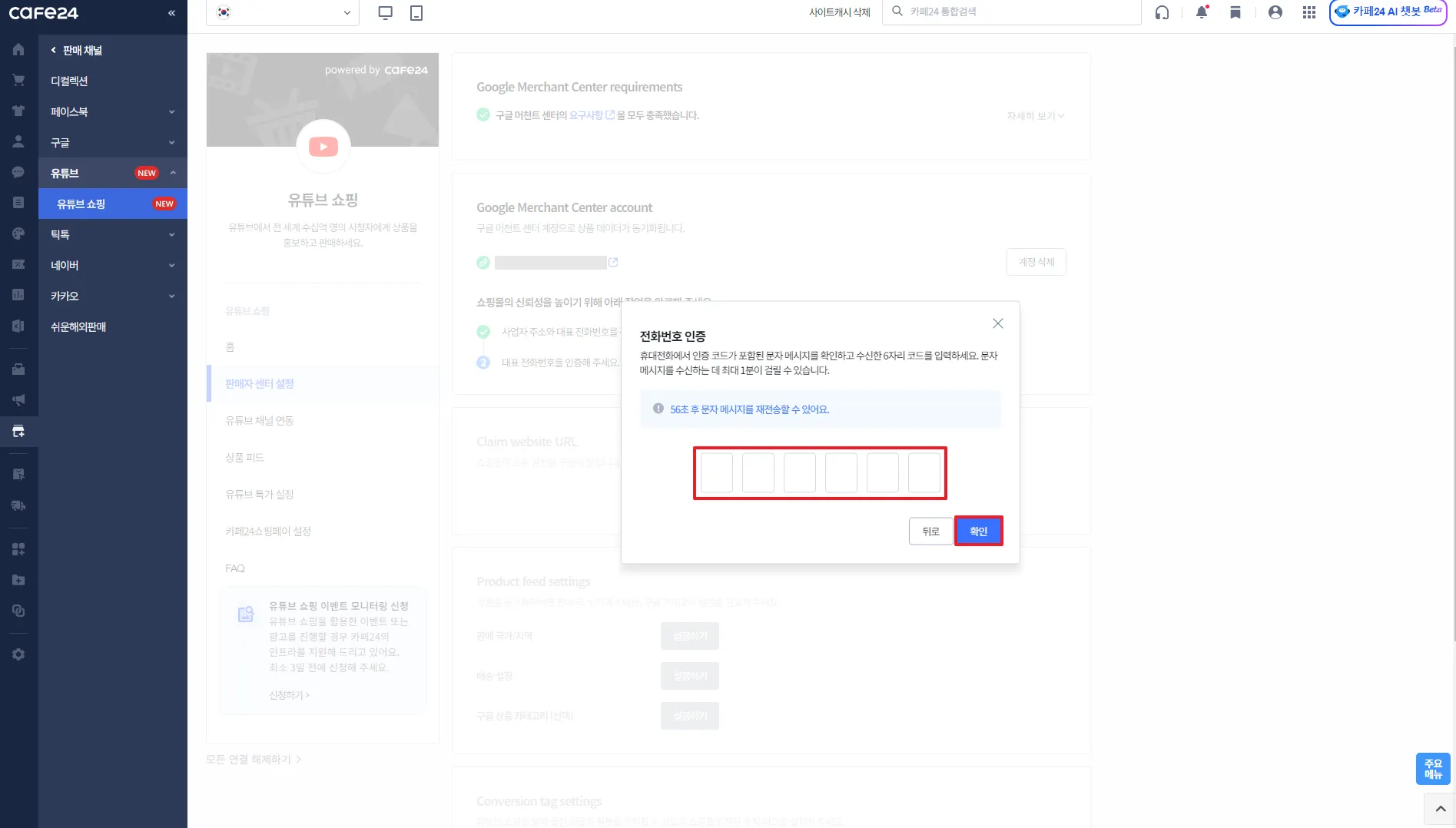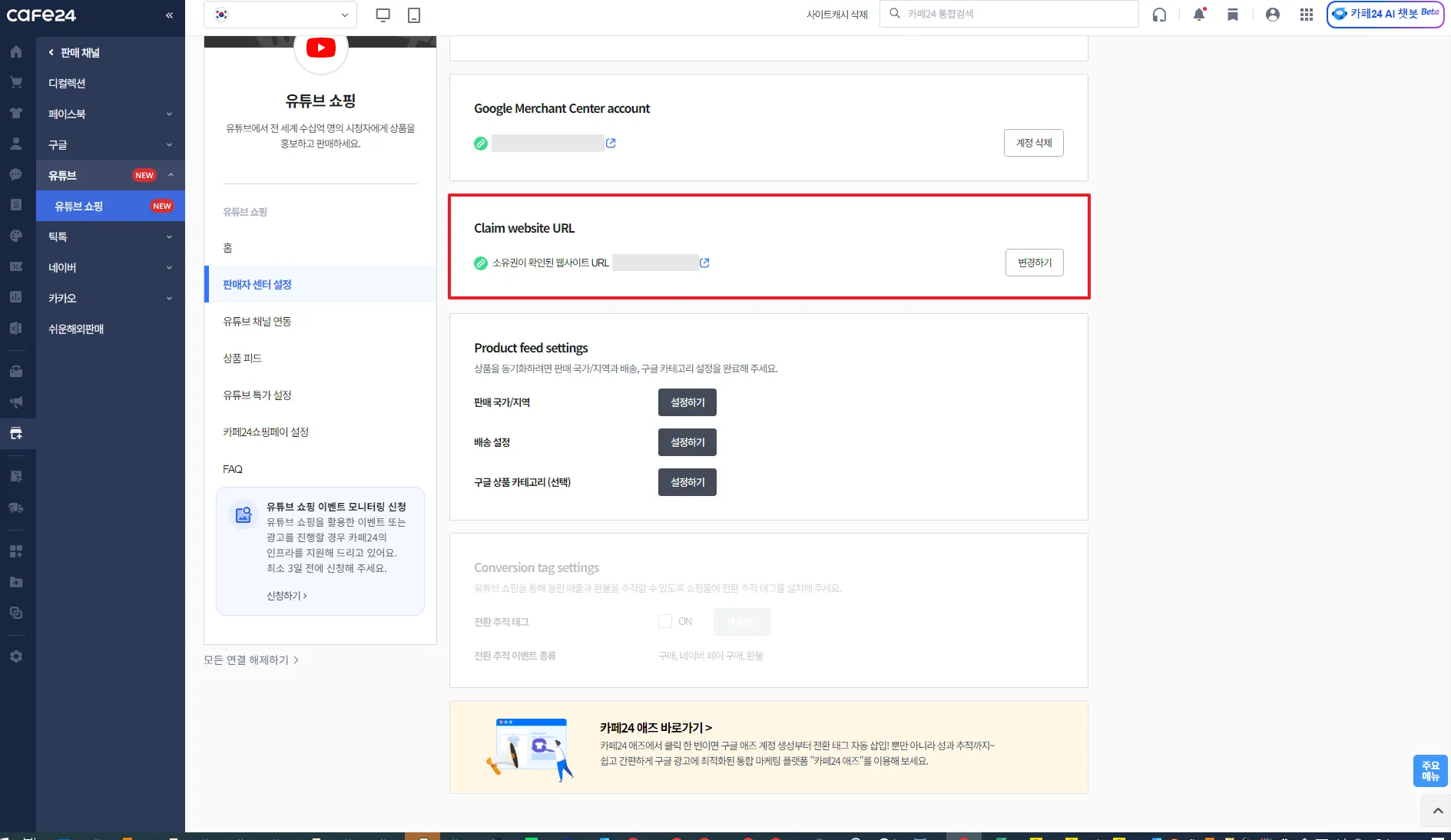 카페24 쇼핑몰과 연결할 유튜브 채널 선택