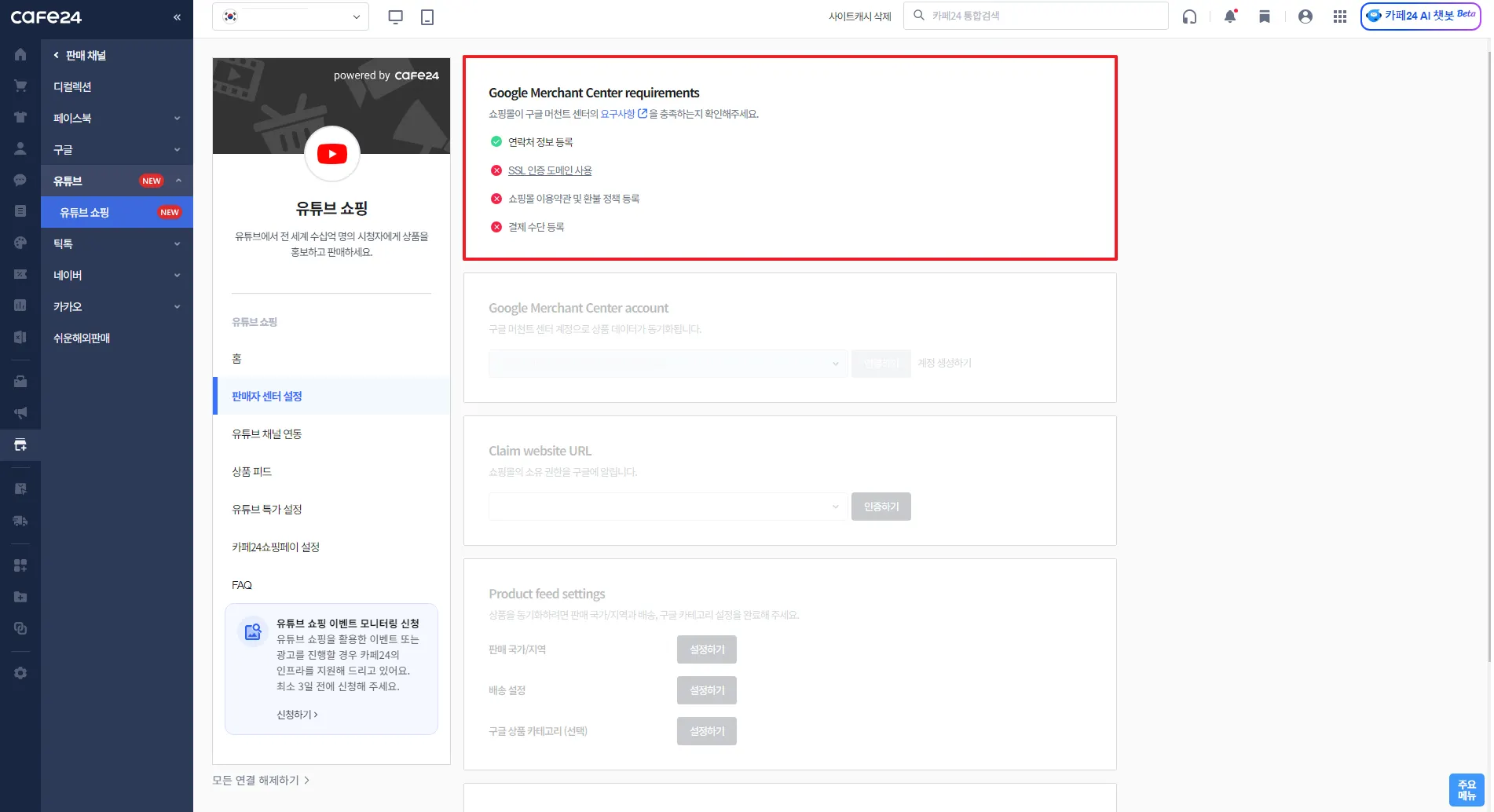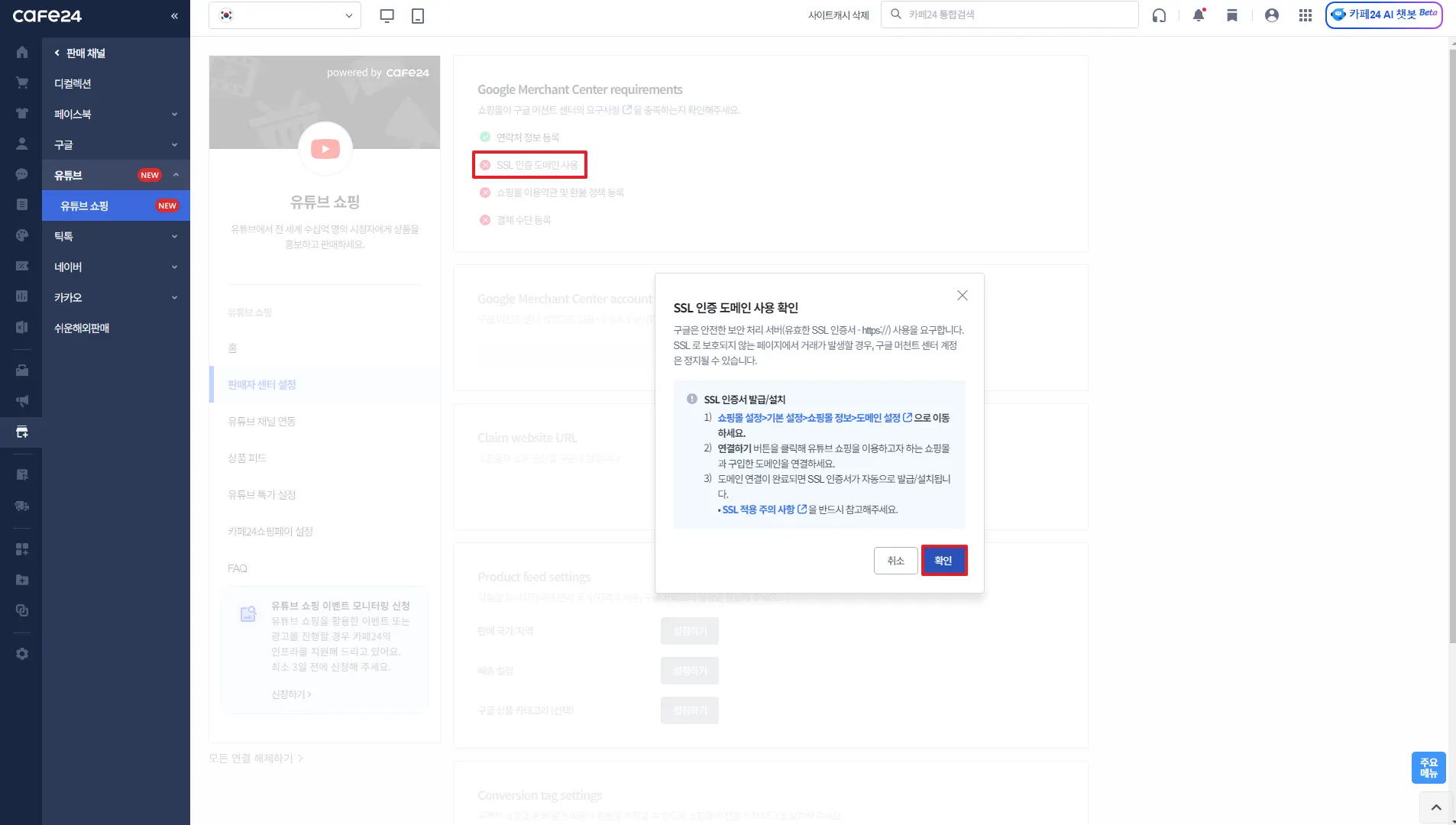 쇼핑몰 도메인에 SSL 인증을 하지 않으면 구글판매자 센터 계정이 정지될 수 있습니다.