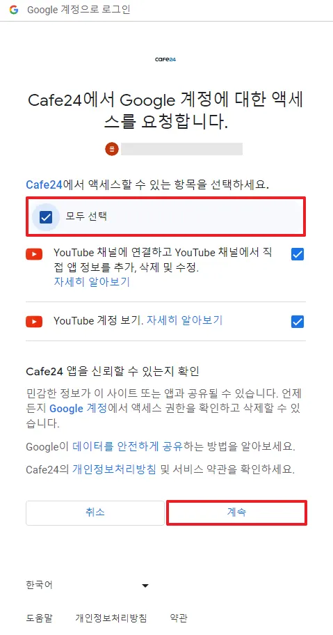 계정에 대한 엑세스 요청 : 모두 선택 후 계속